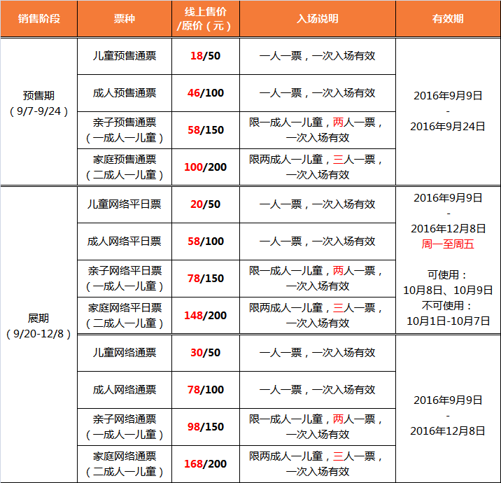 1.儿童票、成人票一人一票;亲子票两人一票;家庭票三人一票,凭票入场。
