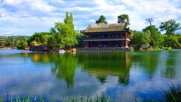 承德避暑山庄 位于河北省承德市,曾是中国清朝皇帝的夏宫,也是现存最大的古典皇家园林之一。始建于1703年,历经康熙、雍正、乾隆三代皇帝,耗时89年建成,内部由皇帝宫室、园林和寺庙群所组成。分为宫殿区、湖区,山区、平原区四大区域,其中宫殿区和湖区是避暑山庄的精华所在。此外,园中有不同规格的28座蒙古包,皇家藏书阁文津阁,永佑寺、春好轩、宿云檐等建筑,非常值得游览。