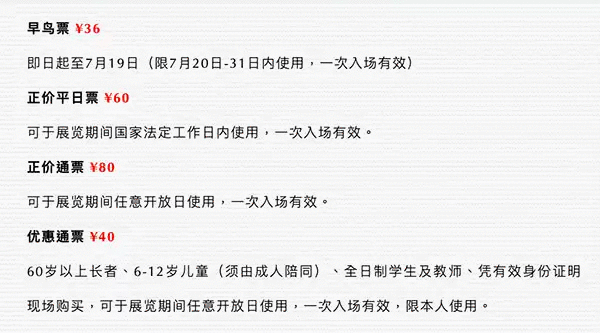 | 入场时间 | 周一至周五 10:00-19:00, 周六及周日 10:00-21:00 展览闭馆前30分钟停止入场 | 限购说明 | 每单限购6张 |