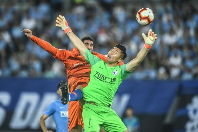 7月27日,山东鲁能泰山队球员费莱尼(左)与大连一方队门将张翀争抢头球并打入进球,后进球被判无效。