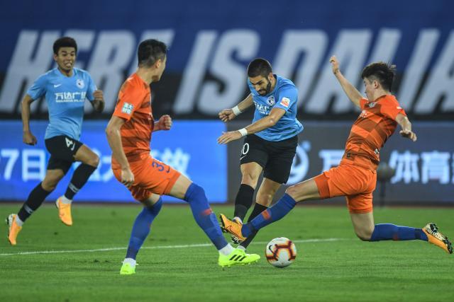 7月27日,大连一方队球员卡拉斯科(右二)在比赛中射门。