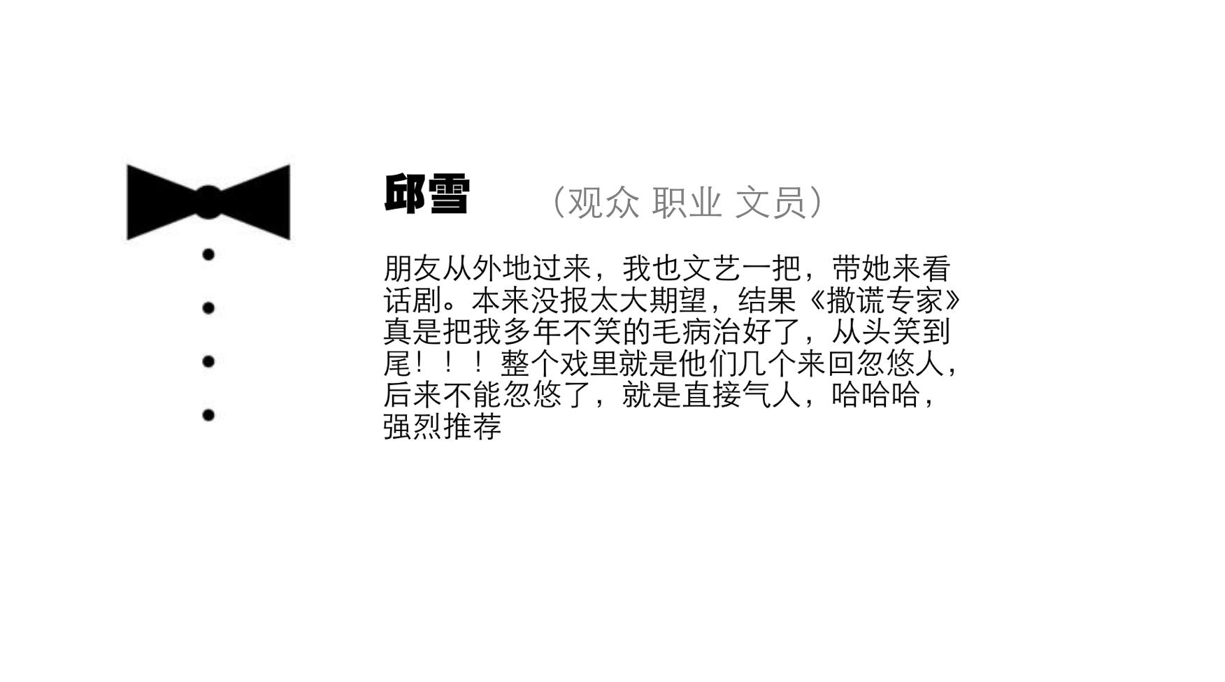 初相遇剧社黑色幽默话剧传奇作品《撒谎专家》登场重庆!不停止爆笑与震撼,超强烈笑声与感动,小剧场话剧不可错过作品! 一个爱撒谎的男人,却突然变得只能说真话,面对巨大诱惑,笑料百出却又感人至深!