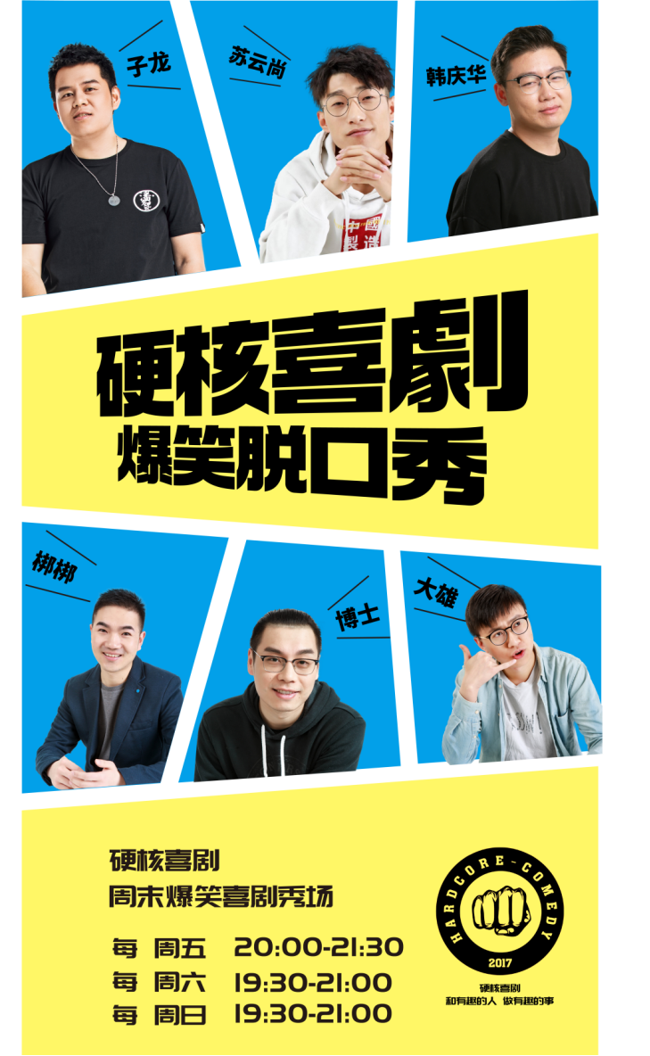 硬核喜剧是一家致力于喜剧内容创作文化传媒公司。众多喜剧综艺的幕后内容输出团队。业务立足于喜剧综艺,情景剧,短视频,现场脱口秀演出四项业务。