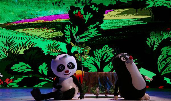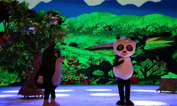 卡通舞台剧《熊猫和小鼹鼠》故事梗概:朱雀红和朱雀蓝举着"微飘"在森林里飞来飞去,传递一条叫人惊喜的信息:熊猫的好朋友、可爱的小鼹鼠决定在中国的森林里安家。这个信息一下子成了爆炸新闻,森林里的小动物们乐翻了天,他们动脑筋,为小鼹鼠准备各种奇特的礼物,有的准备了五星级竹床,有的准备了核桃、花生、板栗等干果,也有的准备了新鲜的蔬菜水果,还有的编织了精美的地毯。狐狸这两天行动诡秘,引起了小动物们的疑心,设立了瞭望哨用望远镜观察,分两路兵马暗地里跟踪,看狐狸到底要搞什么鬼名堂……温暖助人的爱心,好看好玩的故事,让观众从进了剧场就兴奋、激动、开怀畅笑。