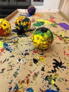 小朋友使用各种种类大小的球类,蘸取颜料后在空白区域创作,滚出或踢出彩色轨迹