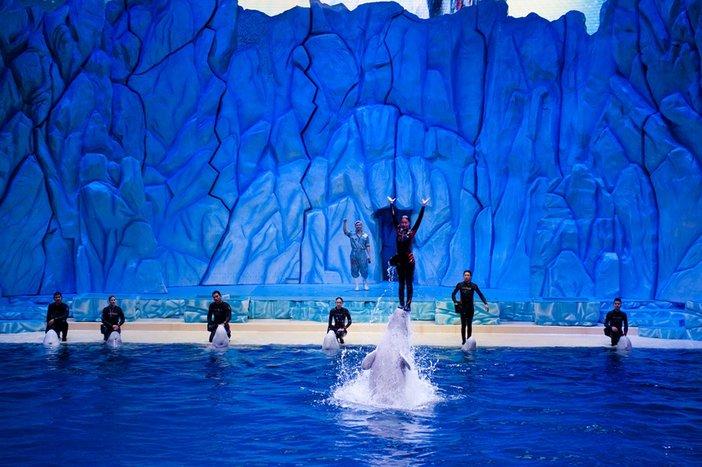 珠海长隆推出了三个动物剧场表演——白鲸表演、海豚表演和海狮表演。白鲸剧场是其中一个必去的热点节目。歌手李宇春在参与《奇妙的朋友》的录制时,还曾经亲自体验训练白鲸的过程。海豚表演看多了,白鲸表演。