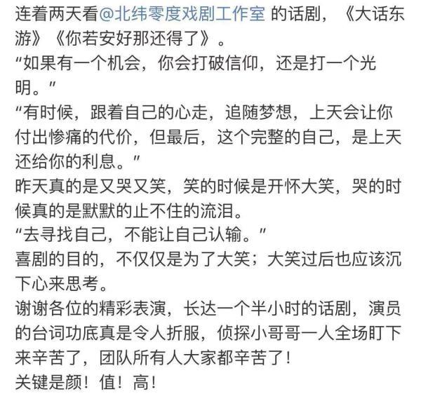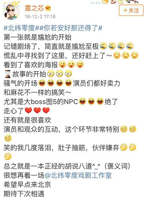 北纬零度戏剧工作室倾力打造以让观众欢笑为本的舞台剧演出,以多种样式融合的喜剧风格获得了各地观众的喜爱和支持。力求创作、制作、推广具有“北纬零度”工作室鲜明风格的舞台剧作品,不断推出风格各异且具有时代精神的优质戏剧。让您捧腹大笑放松压力的同时,又可以找到情感的宣泄和意义的共鸣。 截止2019年,常态演出场次达3000场,全 国各地巡演也逾百场,获得众多观众的支持和好评。2016年、2017年获得全 国票房前十。