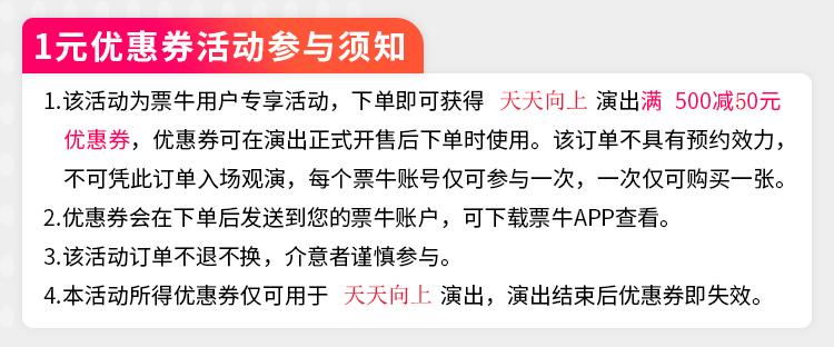| 电子票 | 本项目支持凭电子票入场。 -现场扫码验票或凭姓名手机号入场(以现场为准);扫码验票流程:打开票牛APP→订单详情→票券详情→现场扫码入场。 | 用券限制 | 该演出不可使用优惠券。 |