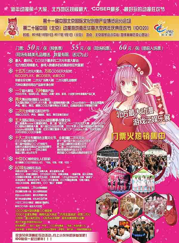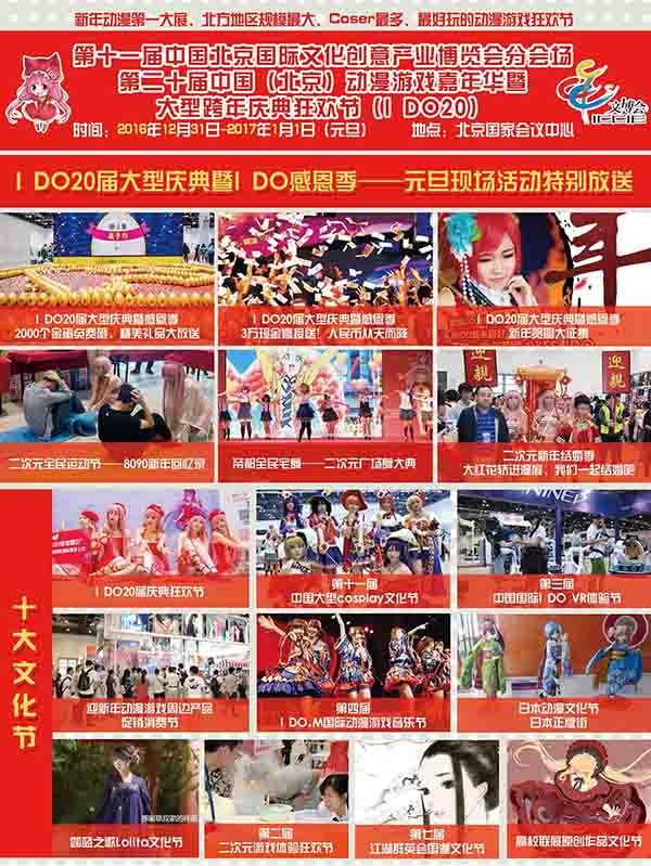 2017年元旦新年伊始,北方规模最大、观众最多、coser最多最好玩的动漫游戏狂欢节,第二十届中国(北京)动漫游戏嘉年华——大型跨年庆典狂欢节(I DO20),将在北京国家会议中心盛大开幕!15万二次元的年度大聚会超趴踢、新年动漫第一大展,元旦+寒假北京最大动漫游戏盛会!2017迎新年二次元联欢晚会特别活动、两大舞台精彩Live演出、三大庆典活动、五大二次元顶级大赛、十大二次元专属文化节、数十位国内外顶级嘉宾签售、50余项现场互动体验活动、万种动漫游戏周边产品!春节前华北最大的动漫游戏盛会一定不要错过!2016年12月31-2017年1月1日元旦让我们共聚北京国家会议中心、共度狂欢!