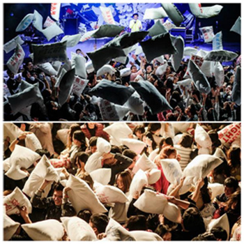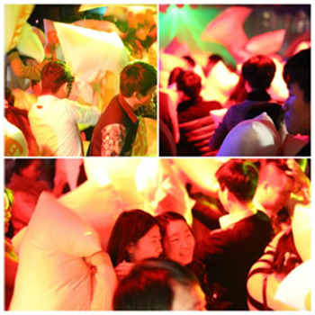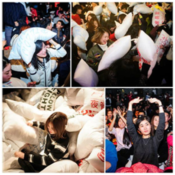 枕头大战,一种风靡全球的缓解工作和生活压力的减压聚会方式,具有快速减压、交友、高互动性等特点,是一种新型"软暴力"宣泄模式,容易被内敛的国人接纳,由夜管家网首家引进入国内,创立"超级枕头大战"品牌,每年在上海、北京、深圳等地举办,已连续举办10年,历久弥新,每年会增添新元素。参与人员多元化,得到国内外各大媒体的追捧和报道。枕头大战由参与者互相用枕头击打对方,在一种"软暴力"中释放压力,获得欢乐。