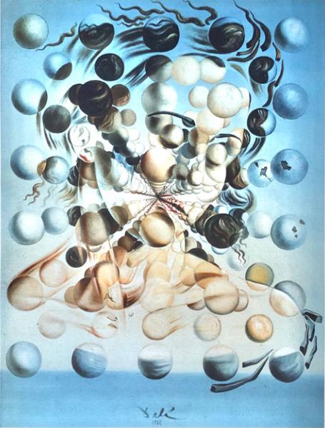 《球形加拉塔》作品创作背景是第一次核弹爆炸后。那时候达利对"物质是彼此不接触的原子"产生了兴趣和思考。在这幅绘画中,他用球形指代原子,用原子爆炸的方式,描绘了妻子加拉。虽然这些球形彼此不连续,最终却呈现了惊人的3D效果。