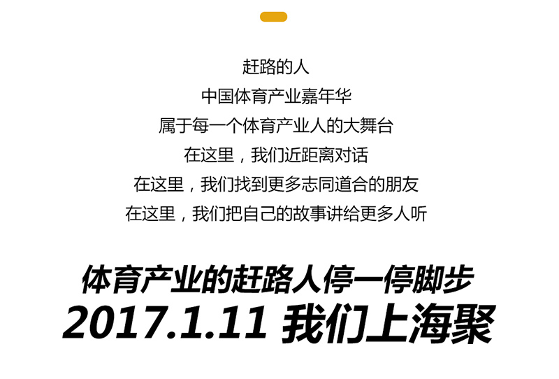1月11日,在上海,由懒熊体育主办的“赶路的人”2017中国体育产业嘉年华将准时到来,我们将与2000多位体育人一起回首来路,共话未来!