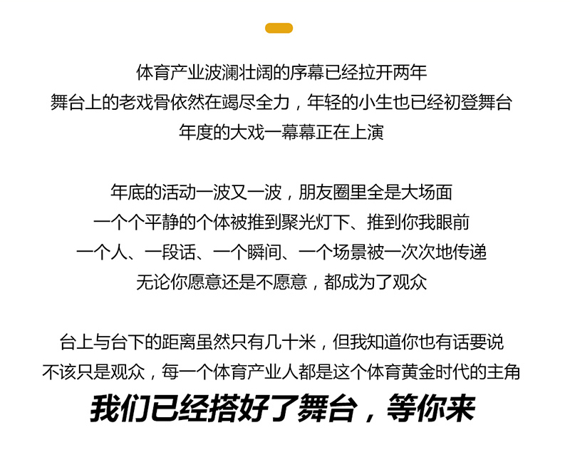 回顾历史,文明的主线是信息和能量,但荣誉属于个体。回看中国体育产业的过去一年,荣誉属于巨头,属于行业的中流砥柱,但最终属于每一个赶路的人。