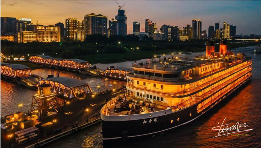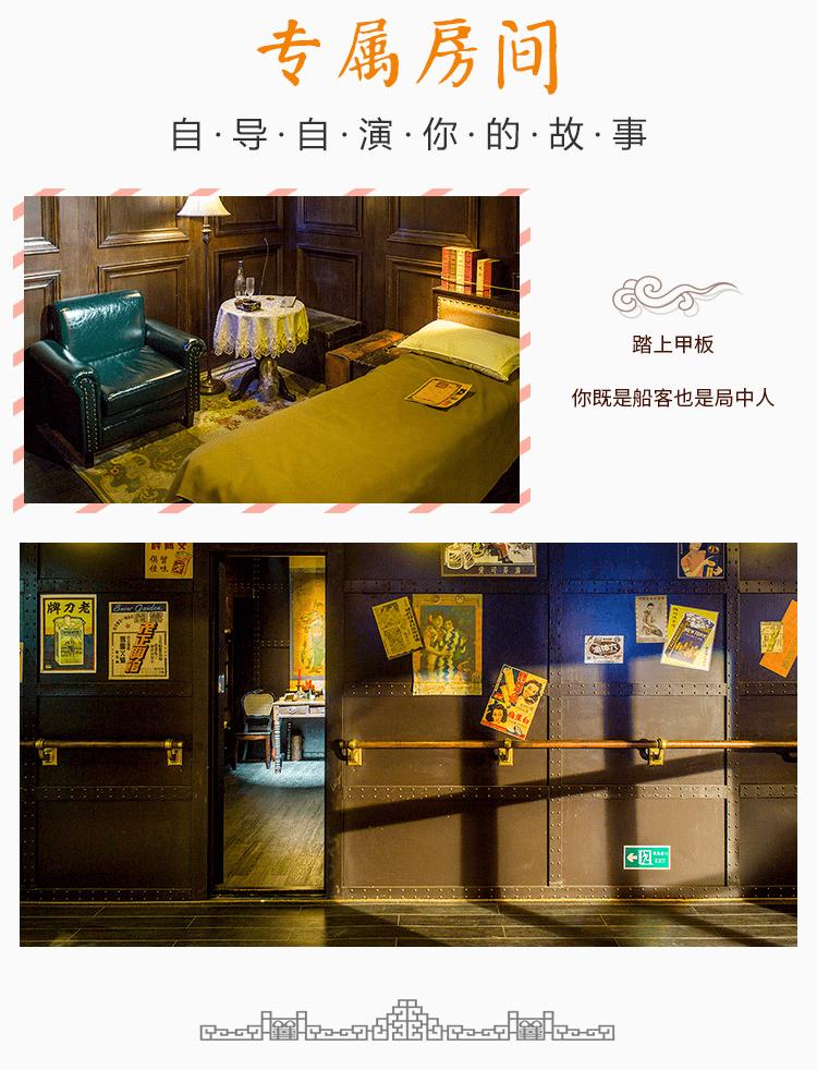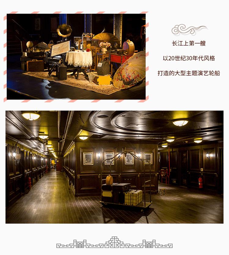 黄包车叮当作响,人们鱼贯走上码头,还未换取一张老船票、登上这艘老轮船,演出就已经开始了。200余米的码头上,穿梭卖报的小童、卖力吆喝的小贩、提皮箱戴礼帽的绅士、匆忙赶路的旗袍淑女,一瞬间好似穿越回百年以前。踏上甲板,你既是船客也是局中人。整艘船都是戏剧上演的舞台,三层各具特色的船体空间,灯火通明的主甲板餐厅,浮沉晃动的近百间客房……不必在观众席上正襟危坐,因为船上的每个角落都是故事发生的地方。你可以踏进客房舱门,选择一件自己喜欢的服饰替换上身,在吧台小酌,在甲板远眺,尽情享受打破一切常规的戏剧演出