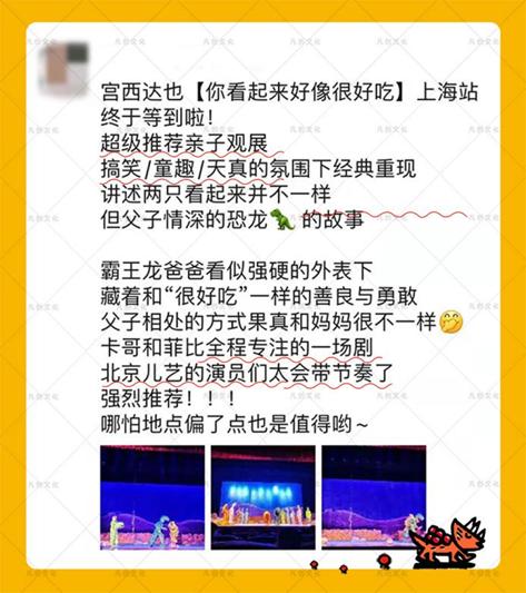 《你看起来好像很好吃》是宫西达也受欢迎的绘本之一,多次被推荐为必读的优秀儿童作品!北京儿艺的这部《你看起来好像很好吃》登上了2012年中央电视台少儿春晚的舞台,为千万个中国家庭展现了这部“感动的巨篇”。