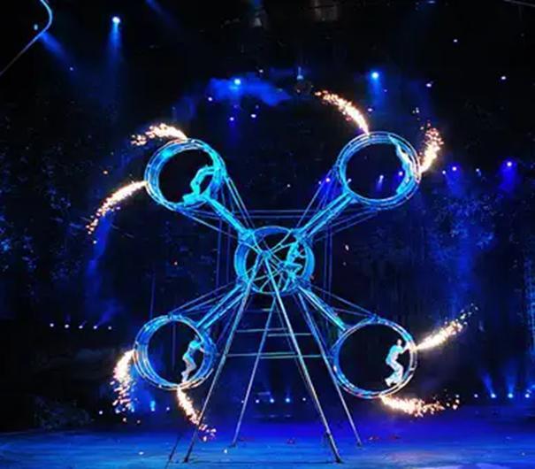 随着激动人心的音乐,演员在空中旋转的大轮中行走跳跃做出各种高难度动作。非常惊险哦!