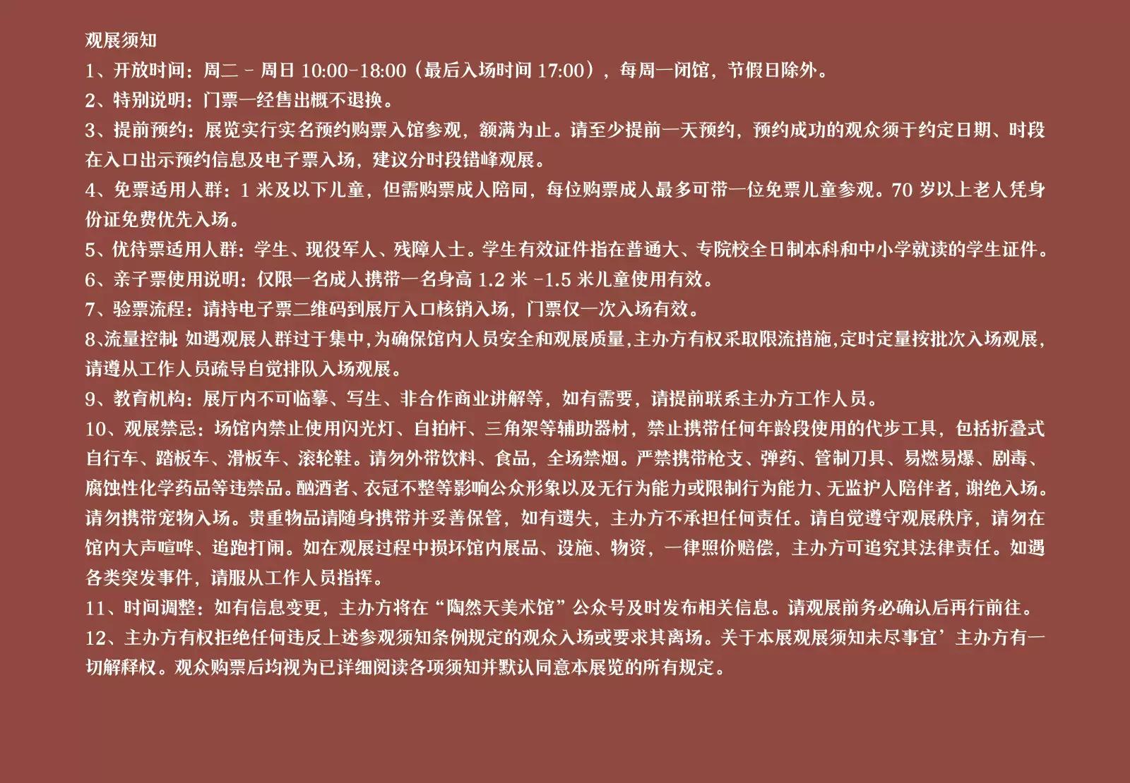 | 座位类型 | 现场不设座位,均为站席观演 | 儿童入场提示 | 1米及以下儿童免票,但需购票成人陪同,每位购票成人最多可带一位免票儿童参观。 |