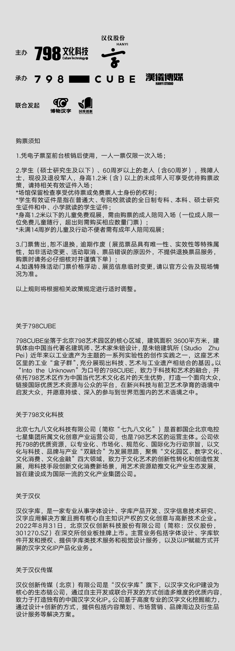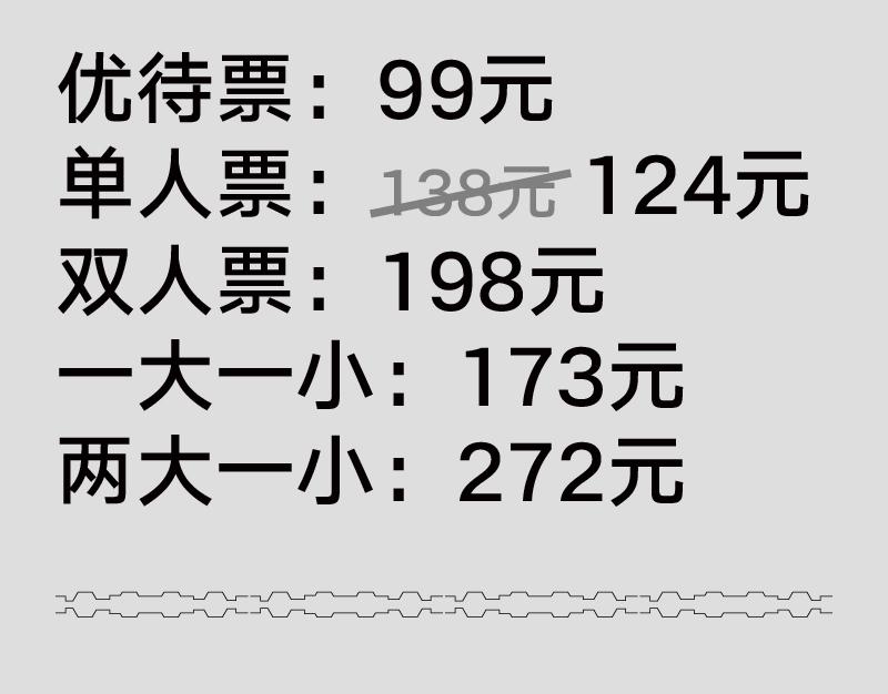 | 座位类型 | 现场不设座位,均为站席观演 | 儿童入场提示 | 1.2米(含)以下儿童免票,需由购票成人陪同入场(一位成人限一位免费儿童随行,超出则需购买相应数量门票);1.2米以上需要购买优待票;未满14周岁的儿童及行动不便者需有成年人陪同观展。 |