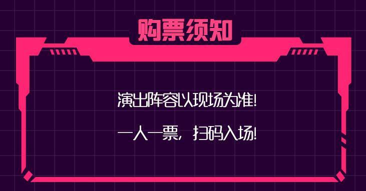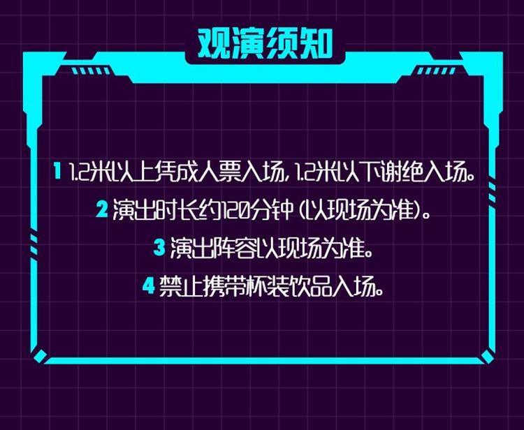| 座位类型 | 请按门票对应座位,有序对号入座 | 儿童入场提示 | 1.2米以上凭票入场,1.2米以下谢绝入场 |