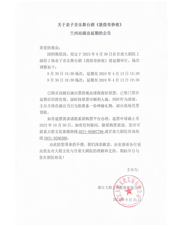 2023年9月30日甘肃大剧院《敦煌奇妙夜》拟延期至2024年4月13日,演出场馆及场次不变。退票申请截止至2023年10月30日。