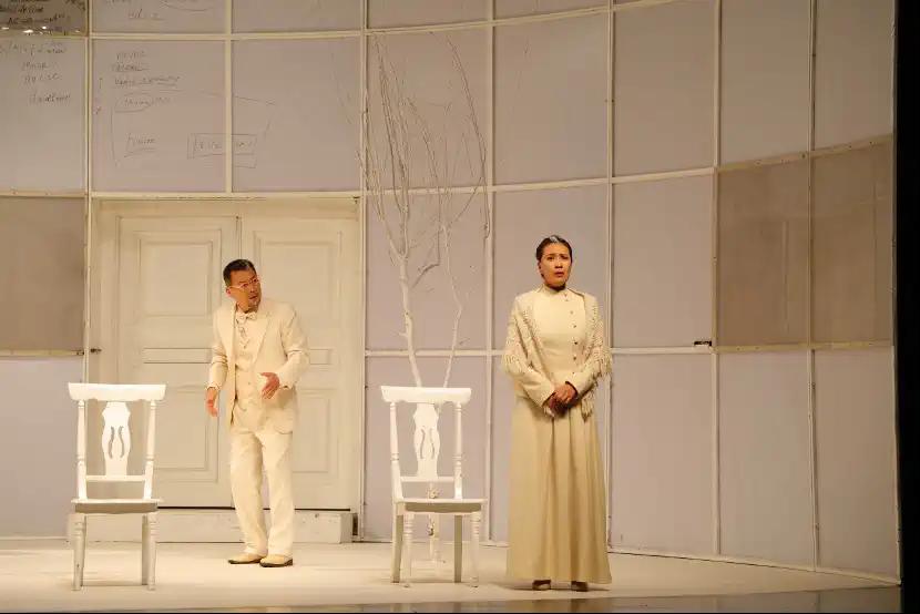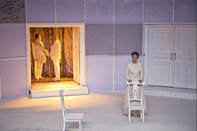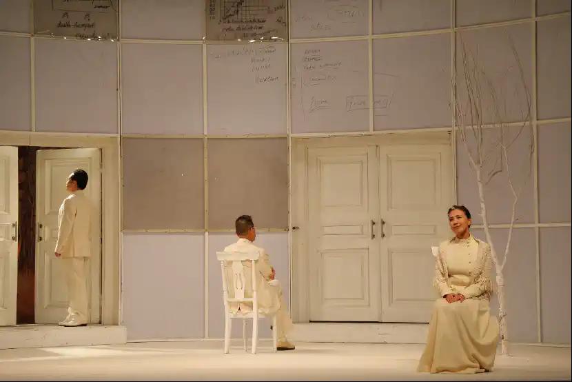 《哥本哈根》是个难题。三个灵魂,在另一个世界对话,试图弄清楚一些搅扰他们后半生甚至连灵魂都不得安宁的事情,于是这个戏便没有了正常逻辑的时空概念,尤其是时间在这里没有了线状连贯性,成了破碎、断续、颠倒、重复的状态。于是,我们习惯或者我们认定戏剧应该有的线性情节逻辑、线性人物发展也就没有了,这是我们阅读、理解此剧和观众观看此剧的最大难题。