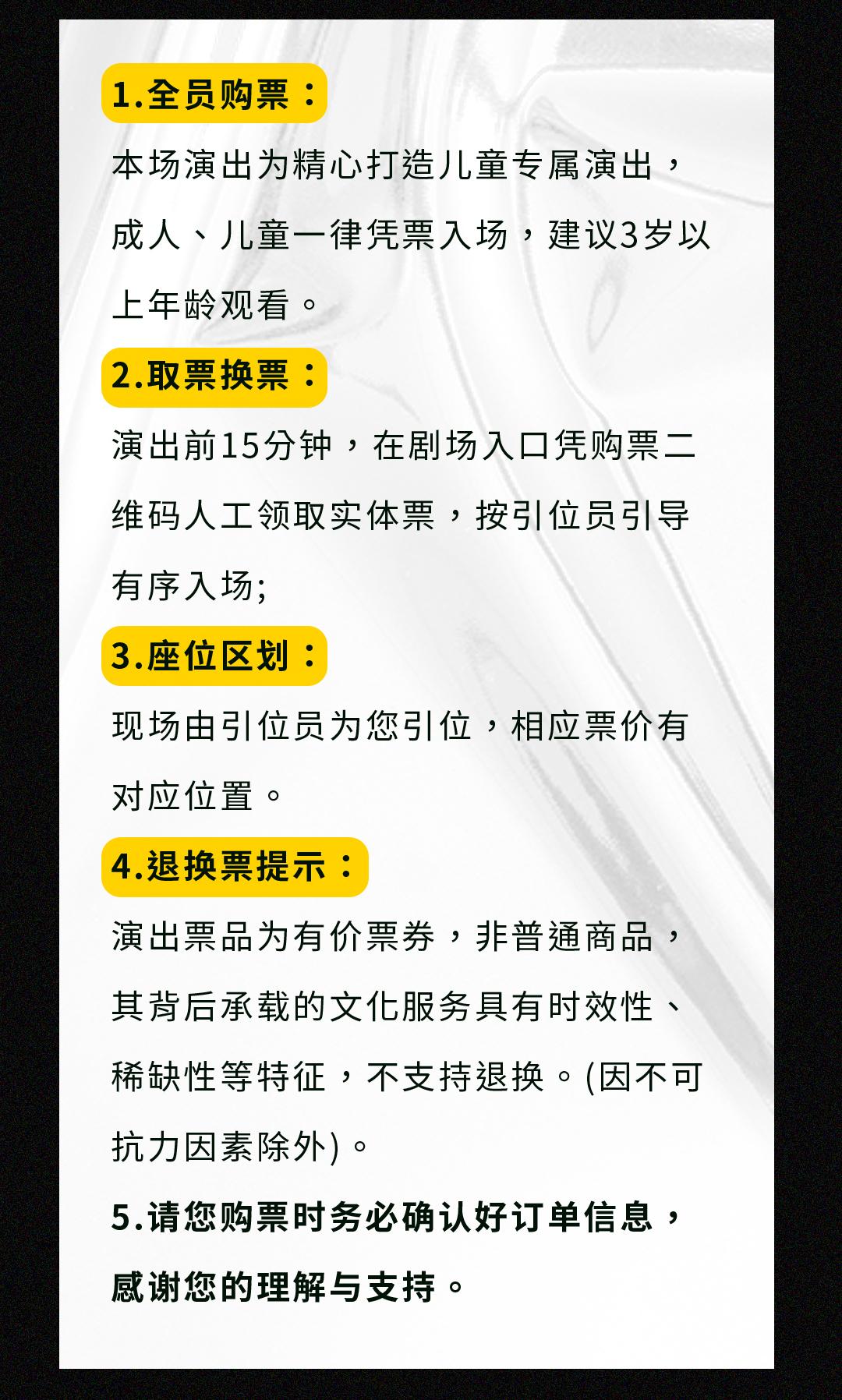 | 座位类型 | 请按门票对应座位,有序对号入座 | 儿童入场提示 | 儿童一律凭票入场 |