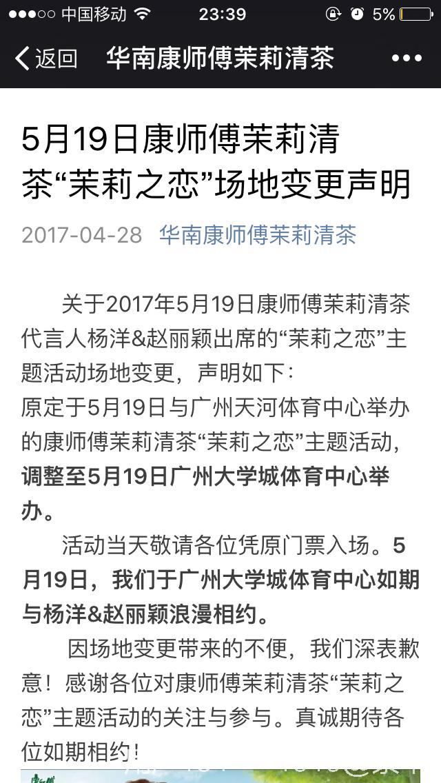 杨洋代言的康师傅茉莉系列将在广州举行明星见面会。还记得杨洋的那句“以后我的茶都给你喝”让淋雨的羊毛们暖心不已,今年又将创造怎样的难忘回忆呢?