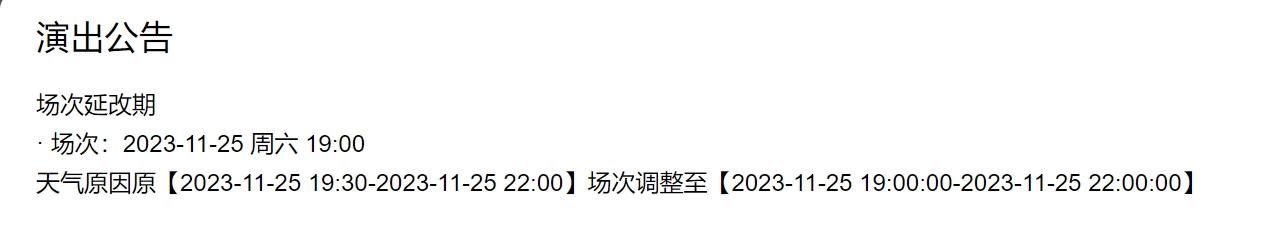 | 重要提示 | 演出现场气氛热烈,请您务必根据自身身体状况酌情是否购票参与观演,特别是患有心脏类疾病、急性心脑血管疾病、心肌炎、高血压等相关疾病的人群,请您务必遵照医嘱,结合病史及个人身体状况进行观演,观演期间请自行承担身体健康相关责任。 | 温馨提示 | 购买前请您提前规划好行程,做好相应准备,以免影响您的正常观演,感谢您的理解和配合。 若演出受不可抗力影响延期或取消,票牛将对演出票订单按照项目官方通知方案进行处理,其他因观演发生的费用需由您自行承担。 |
