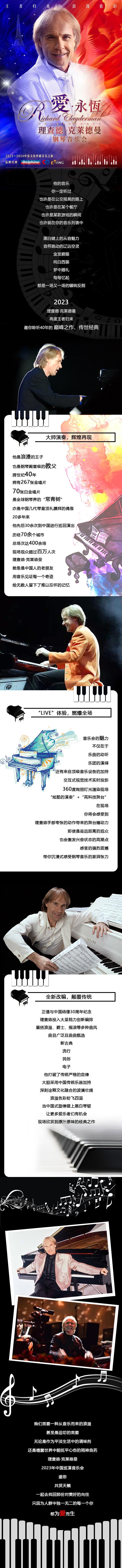 他是浪漫的王子,也是钢琴殿堂级的教父。跨世纪40年,拥有267张金唱片,70张白金唱片,是全球钢琴界的“常青树”,亦是中国几代琴童顶礼膜拜的偶像。理查德的演奏风格亲切细腻且充满浪漫气息,不矫揉造作,不过分修饰,指尖流淌出明亮辉煌的色彩。20多年来,他先后30余次到中国进行巡回演出,历经70余个城市,总场次达400余场,现场观众超过百万人次。理查德·克莱德曼,就像是中国人的老朋友,用音乐见证每一个奇迹,给无数人留下了难以忘怀的记忆。