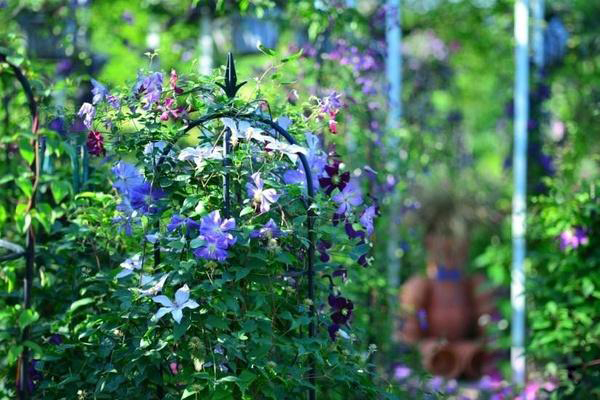 藤本皇后·铁线莲展,面积5000余m2,品种达400余种,结合各类花架,高低错落地搭配,竞相开放。