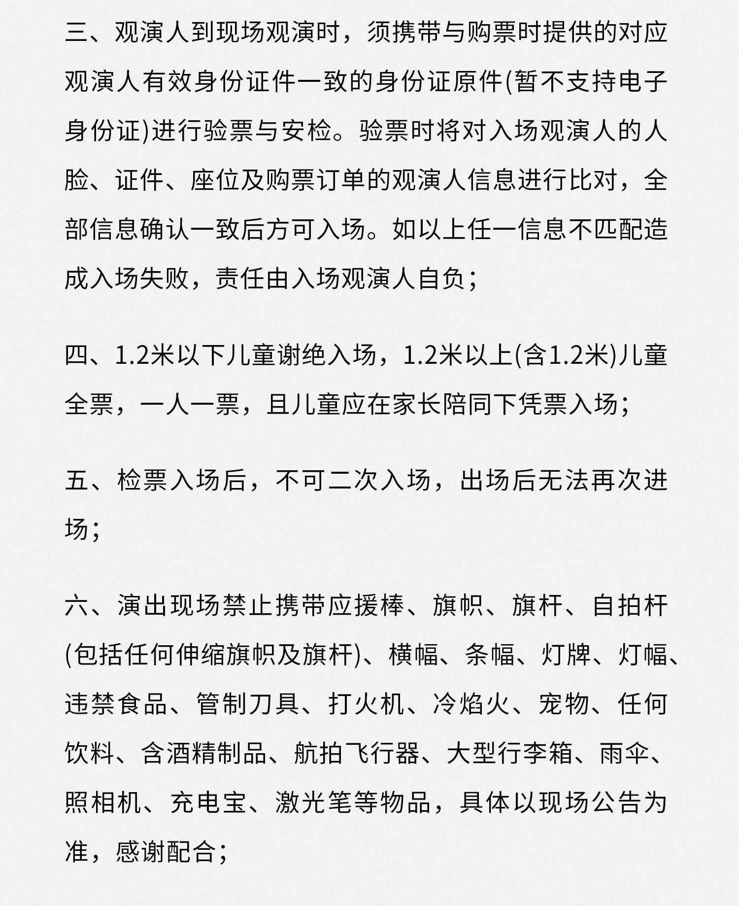 | 限购说明 | 每单限购6张 | 重复购票说明 | 同一位“实名观演人”请勿在多个售票平台重复购票,一位“实名观演人”的身份信息对应同场次的一张门票。 若同一位“实名观演人”被发现存在多个购票平台购买同场次行为,由该行为产生的无效重复订单、退票手续费、过期不可退票、无法入场等所有损失,均由购票人自行承担。 |