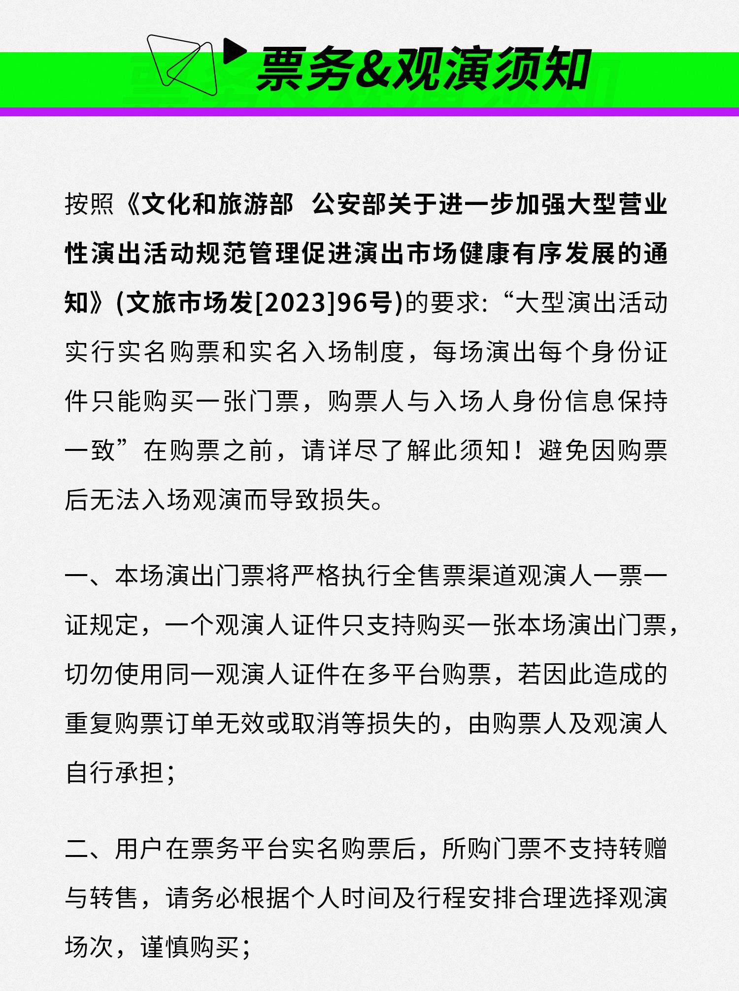 同一位“实名观演人”请勿在多个售票平台上重复购票!一位“实名观演人”的身份信息对应同场次的一张门票。若同一位“实名观演人”同时在多个购票平台购买同场次门票,产生无效的重复订单、退票产生手续费、过期不可退票、无法入场观演等所有损失,由购票人自行承担。介意者慎购!