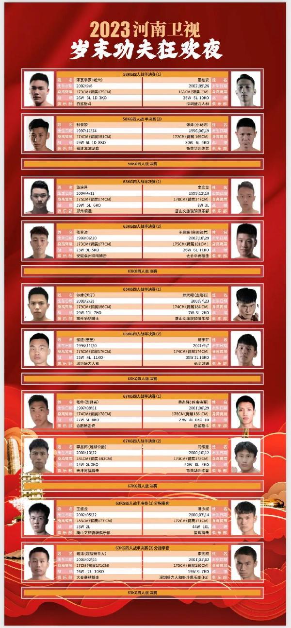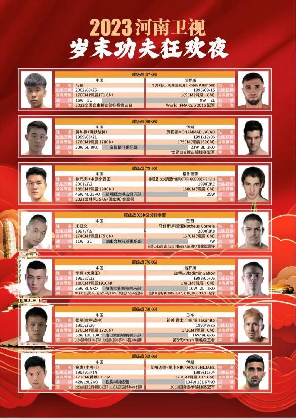 这一次的“河南卫视岁末功夫狂欢夜”将于2023年12月30日在郑州市体育馆开战,在过去的20年间,河南卫视始终保持着对于格斗事业的热爱,在粉丝朋友们的支持下,不断进步的同时,也令中国格斗力量站在了世界格斗的前沿。