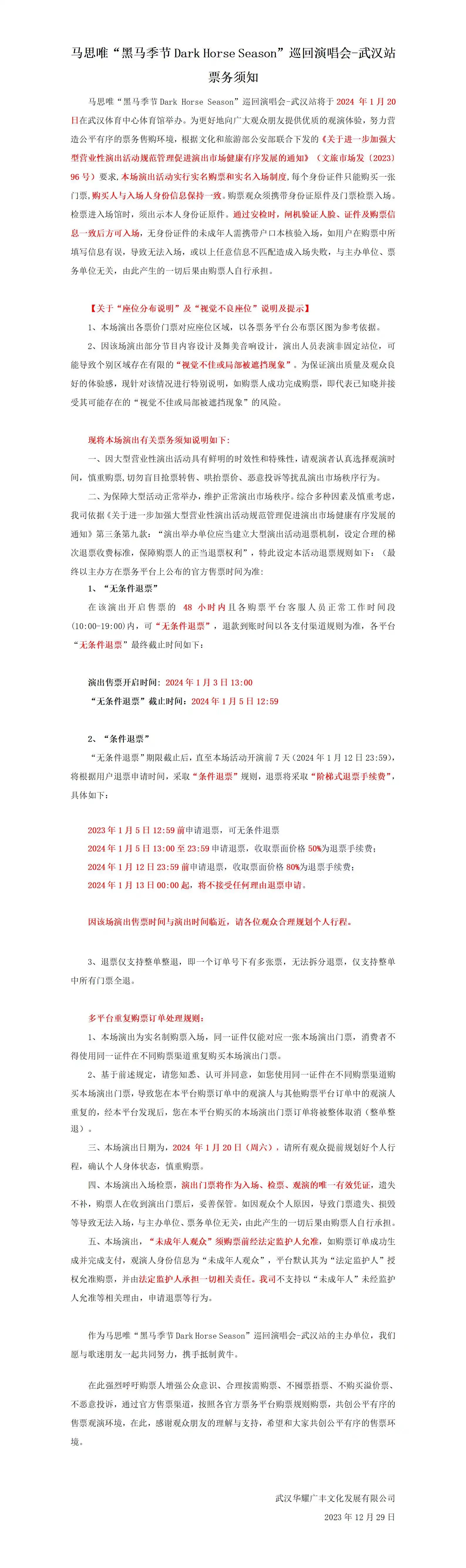 | 发票说明 | 如需开具发票,请在演出结束后一个月内联系客服并提供开票信息:票款发票由商家开具,平台服务费发票由票牛开具。 | 重要提示 | 演出现场气氛热烈,请您务必根据自身身体状况酌情是否购票参与观演,特别是患有心脏类疾病、急性心脑血管疾病、心肌炎、高血压等相关疾病的人群,请您务必遵照医嘱,结合病史及个人身体状况进行观演,观演期间请自行承担身体健康相关责任。 |