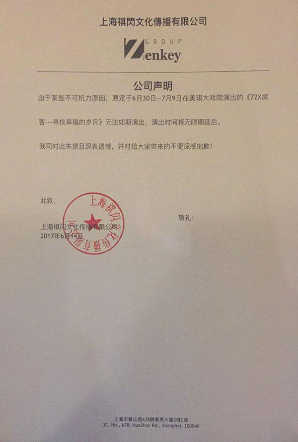该演出因故取消,请购买此演出的观众在截止时间:2017年6月30日前将已收到的票品寄回票牛上海公司,逾期不予受理.