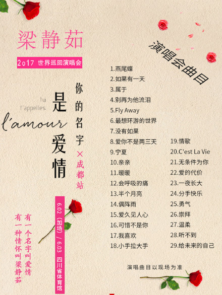 这次梁静茹演唱会的全新主题"你的名字是爱情",正代表她对情歌的那份钟爱之情。她将会用情歌铺满整个演唱会,让她们深深刻在观众的记忆里。"你的名字是爱情"上海起跑后,巡演多个城市,场场爆满,每一站门票都被"秒杀"。