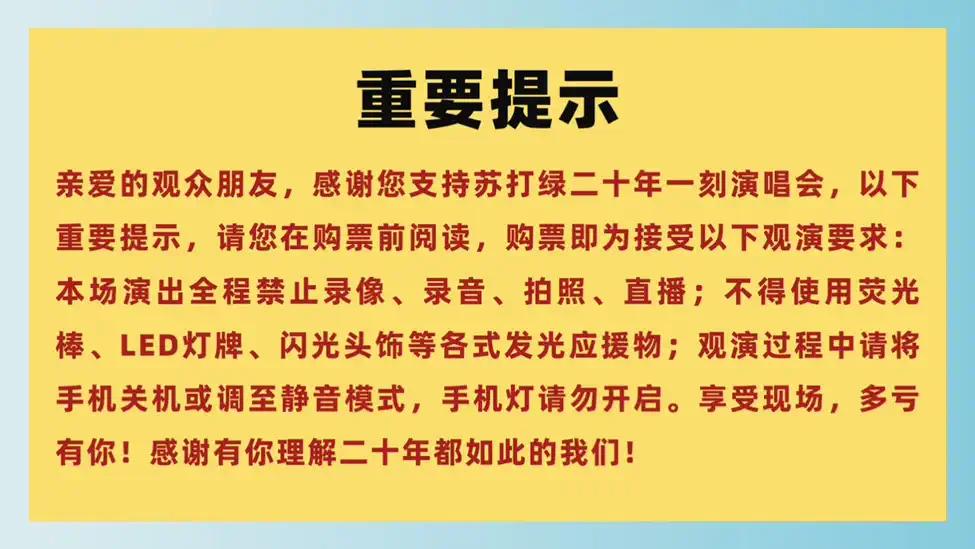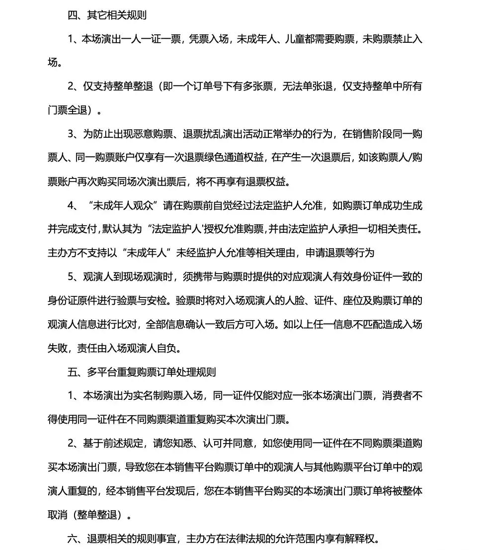 | 限购说明 | 每单限购2张 | 重复购票说明 | 同一位“实名观演人”请勿在多个售票平台重复购票,一位“实名观演人”的身份信息对应同场次的一张门票。 若同一位“实名观演人”被发现存在多个购票平台购买同场次行为,由该行为产生的无效重复订单、退票手续费、过期不可退票、无法入场等所有损失,均由购票人自行承担。 |