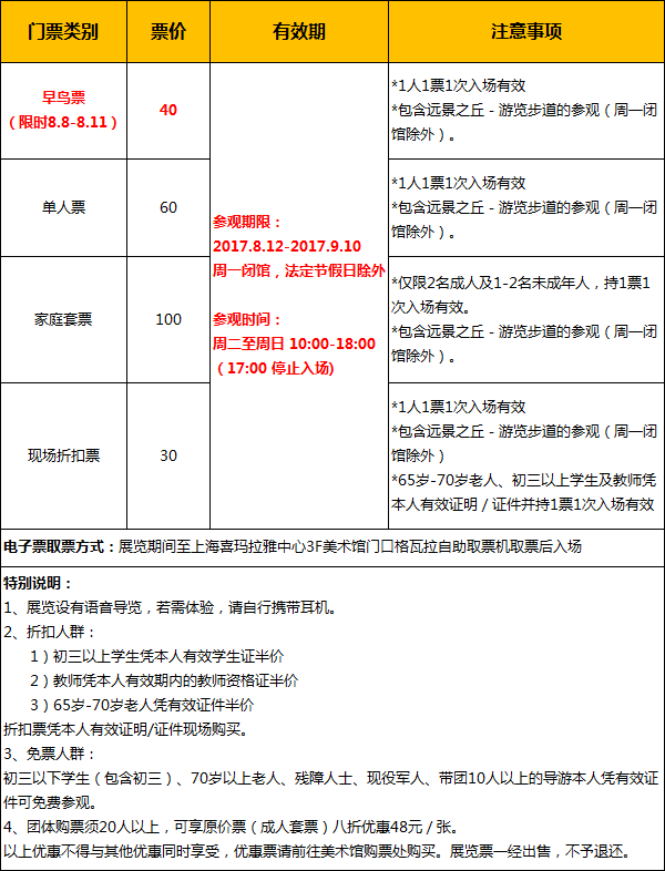 | 限购说明 | 每单限购6张 | 服务费说明 | 为了给您提供便利的在线购票服务,票牛为此投入大量的平台技术支持、运营维护支持,并联合平台入驻商家、第三方在线支付服务商、第三方合作商等合作方为您提供服务,基于前述平台成本及合作方服务费用,票牛向您收取不超过票款5%的平台服务费(最高不超过400元)。 票牛收取的平台服务费,主要可能包括如下内容:1.票牛的线上平台和软件系统开发维护成本。2.支付宝、微信等第三方支付服务商收取的支付手续费用。3.物流公司收取的票品寄送费用(如纸质票)。4.客户服务成本以及短信、电话等通道费用。5.为用户提供购票保障服务对应的运营与管理成本。6.其它为完成用户订单必须的相关服务成本、人员成本等。 |