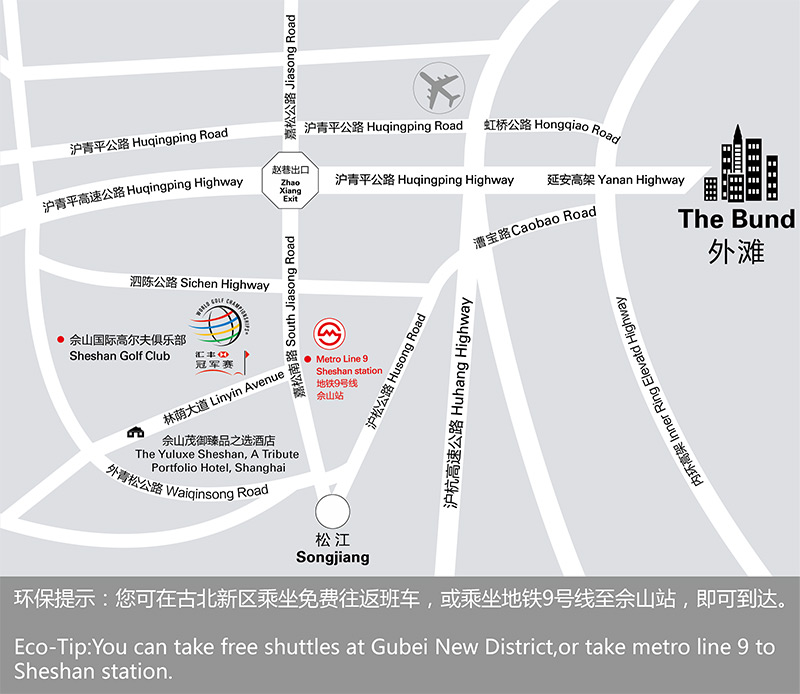开车路线:沿G50高速行驶,行至佘山/赵巷出口,左拐进入南嘉淞中路,之后按沿途的“世锦赛-汇丰冠军赛”广告牌驶入佘山国际高尔夫俱乐部。