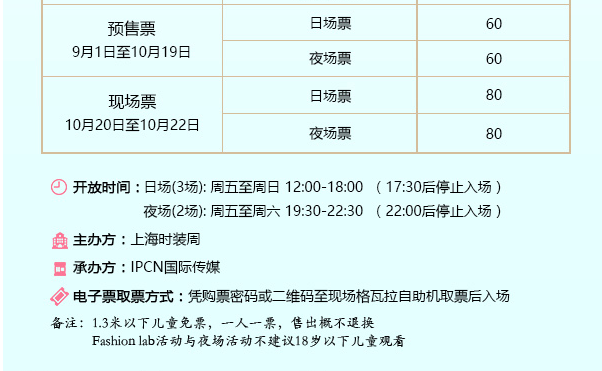 | 其他说明 | 1.3米以下儿童免票,一人一票 | 电子票 | 本项目支持凭电子票入场。 -请至少提前一天购买,开演前24小时内,票牛会发送取票短信,请按短信提示内容取票。 |