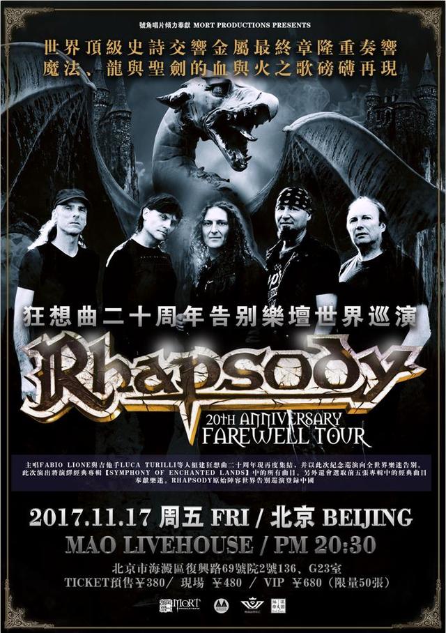 經過二十年的時光磨合,Rhapsody 因團員們音乐理念不合決定解散,並於解散前展開告別樂壇世界巡迴演唱會。2017年11月,主唱Fabio Lione与吉他手Luca Turilli等人组建狂想曲二十周年之际再度集结,并以此次纪念巡演向全世界乐迷告别。他們將再次奏响恢弘的史诗交响篇章,并踏上中国上演三站次巡回。