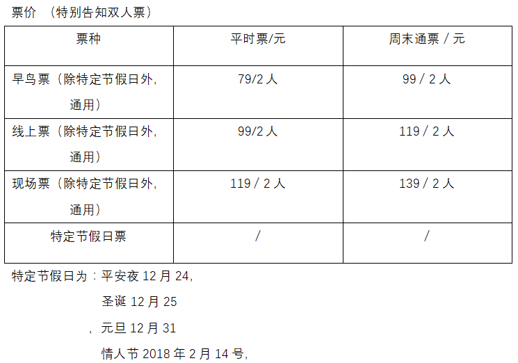 | 其他说明 | 2月15日-2月17日入场时间为11:00-18:00。 每张门票可以允许两人同时入场 营业时间:11:00am—21:30pm (21:00以后停止检票) | 电子票 | 本项目支持凭电子票入场。 -现场扫码验票或凭姓名手机号入场(以现场为准);扫码验票流程:打开票牛APP→订单详情→票券详情→现场扫码入场。 |
