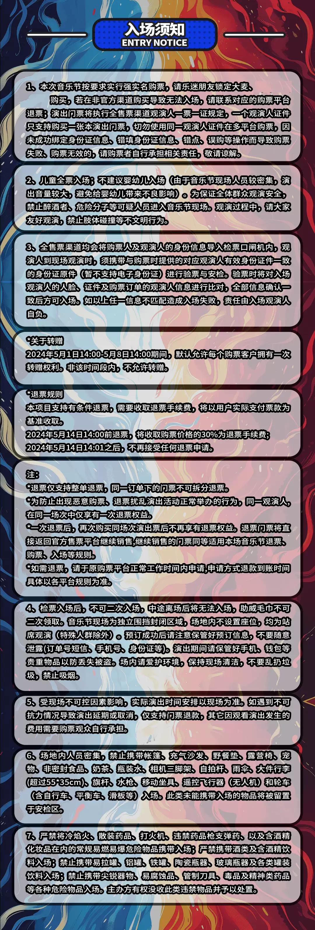 | 重要提示 | 演出现场气氛热烈,请您务必根据自身身体状况酌情是否购票参与观演,特别是患有心脏类疾病、急性心脑血管疾病、心肌炎、高血压等相关疾病的人群,请您务必遵照医嘱,结合病史及个人身体状况进行观演,观演期间请自行承担身体健康相关责任。 | 温馨提示 | 购买前请您提前规划好行程,做好相应准备,以免影响您的正常观演,感谢您的理解和配合。 若演出受不可抗力影响延期或取消,票牛将对演出票订单按照项目官方通知方案进行处理,其他因观演发生的费用需由您自行承担。 |