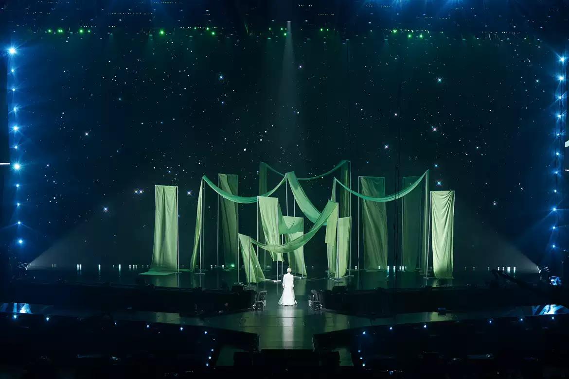 首次在舞美设计中使用可移动延伸台,随着歌曲情绪,舞台前沿高低变幻或延伸向前,透明结构和灯架组合出多种变幻,丰富观众视觉体验。
