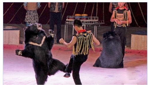 憨态可掬的狗熊摇摇晃晃直立走上台后,它们能在单杠和双杠上做哪些动作呢?熊大的骑自行车水平怎么样?想不想看看狗熊跳高过人呢?在跳绳表演中它们也将随着跳绳的节奏起跳,会让小朋友们乐不可支呢!