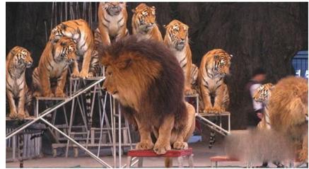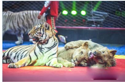 威猛的百兽之王老虎和狮子大摇大摆的走上舞台,它们将表演过桥、过人等惊险动作。让观众叹为观止。
