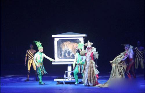 魔术师在奇幻的灯光下将美女关入铁笼,在刹那间揭开布罩,瞬间铁笼里趴着的是一只凶猛的老虎。让人惊叹不已。到时候候小朋友要睁大眼睛看哦!