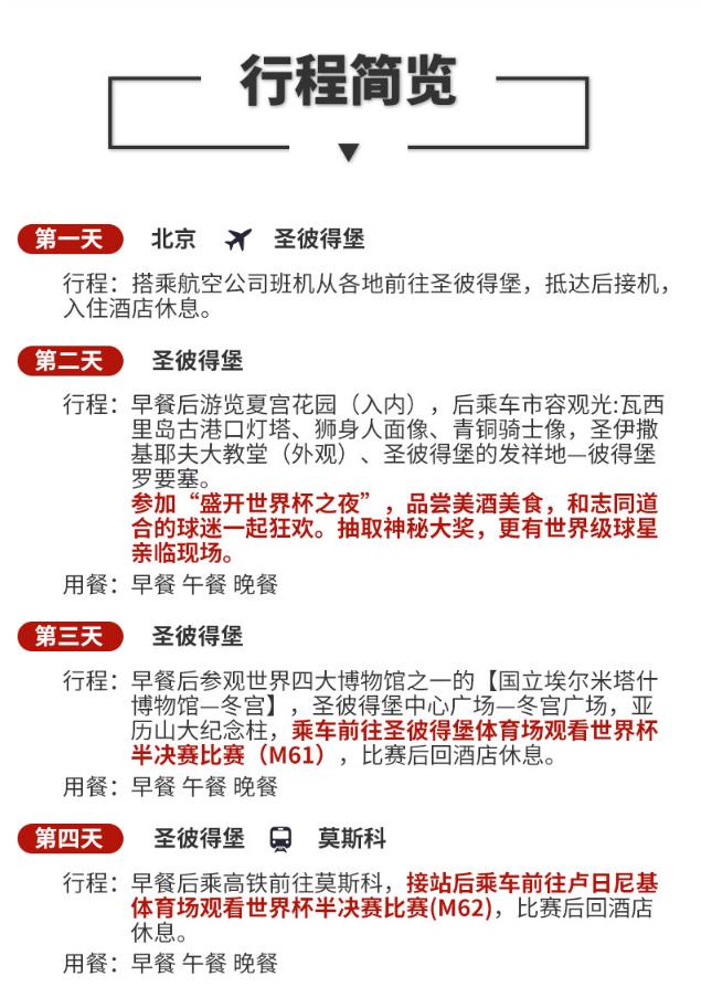 | 其他说明 | 费用包含: 1 两场半决赛一等票以及决赛二等票 2 住宿四星酒店双人间或同级酒店8晚住宿 3行程所述当地地面交通服务费用:空调旅游巴士(俄罗斯每天用车不超过10小时,第一天和最后一天仅含接送机费用) 4 行程所述景点首道门票:冬宫、夏宫花园、克林姆林宫、民俗博物馆 5 行程所列餐食,正餐为14顿团餐。 6 全程中文导游,当地司机、导游服务费及小费。 7 圣彼得堡-莫斯科高铁二等座 退票规则:不支持退票 球票包含:包含两场半决赛和一场决赛球票各一张, 半决赛 M61 2018年7月10日 21:00 圣彼得堡体育场 和 半决赛 M62 2018年7月11日 21:00 卢日尼基体育场 和 决赛 M64 2018年7月15日 18:00 卢日尼基体育场 入园地址:圣彼得堡体育场/卢日尼基体育场 换票地址:盛开另行告知 特别提醒:由于世界杯赛事火爆,本产品25人成团。请仔细阅览页面并联系在线客服确认产品及库存信息后下单。 | 实体票 | 本项目支持凭实体票入场,支持以下取票方式: - 快递配送:运费10元(V4及以上会员包邮),顺丰发货。 - 现场取票:票牛工作人员将在演出开场前1小时至现场派票。工作人员联系方式、具体取票地点将在演出当天以短信通知发送至预留的手机号。 |