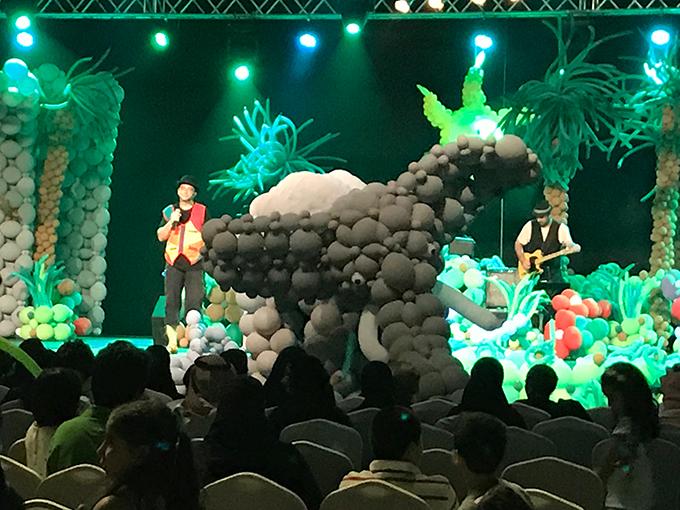在这个童话世界里,一草一木都由气球构成——20组花卉、10组热带花卉、10组大型绿植、8组灌木、5组大型气球墙、8棵棕榈树、1个巨大拱门……在这个奇幻场景里,你还能看到气球编织的巨龙、狮子、大象、犀鸟等各种动物在气球森林里演绎动人故事。不仅如此,气球还变成了演员的头盔、帽子、皇冠、利剑和盾牌……在这个神奇的舞台上,一切的元素都是气球组成。