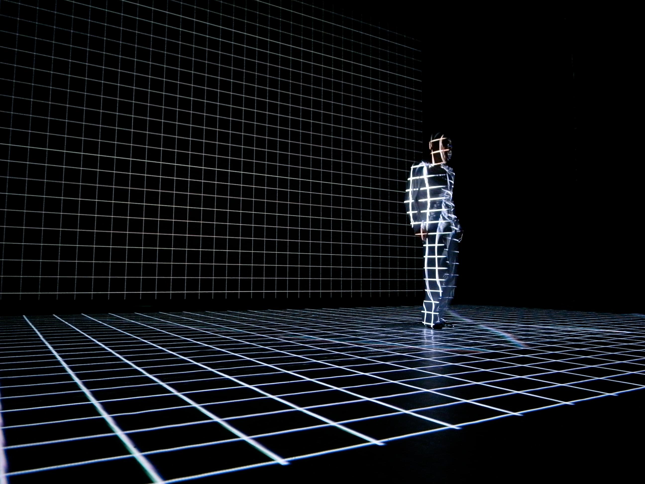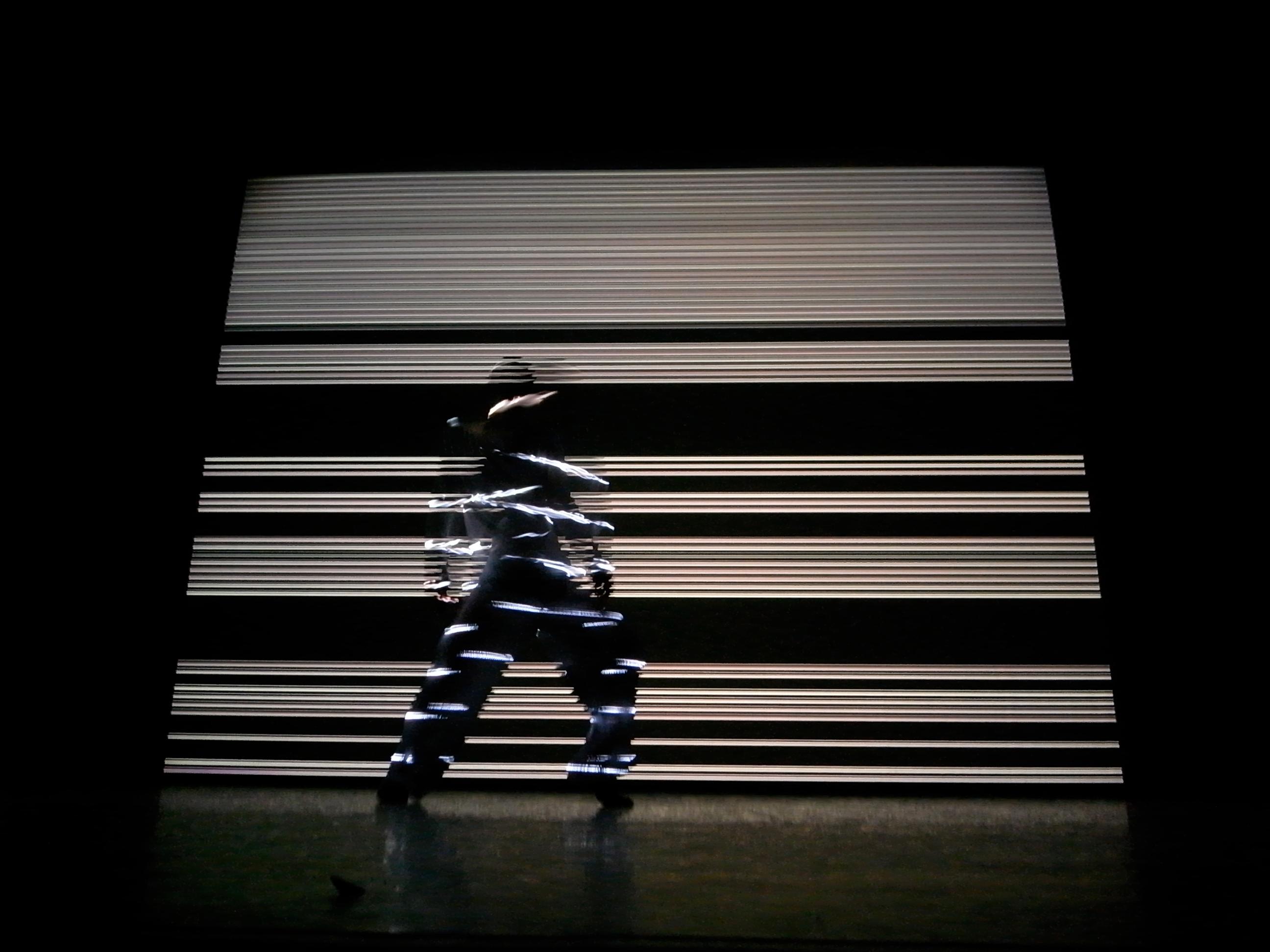 多个投影仪在舞台的地板上、屏幕上、舞者的身体左右两侧投射出无数条光线,它们以不同的速度、朝着不同的方向运动。无穷无尽的光线在几何方阵中交错、闪耀,最终将舞者的身体转化为扭曲的图像,从而产生一种视线上的幻觉。